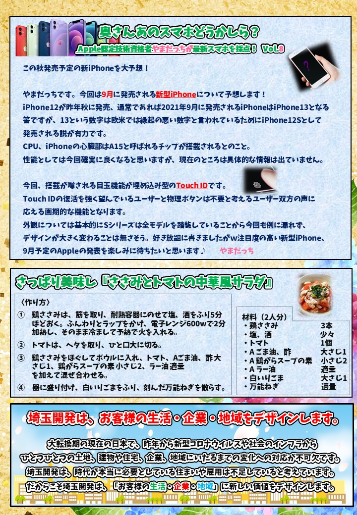 さい通7月号 Vol.14 さい通 2021.07.01 筆者 柳田 直喜 不動産キャリア13年 「住まいで困った事があれば、埼玉開発へ!!」と安心で頼られる存在であり、心地良い豊かな生活を送るため、お客様ひとりひとりの夢と希望を実現していくお手伝いをさせていただきたいです。 また歩く金融機関と言われる程、住宅ローンに強いです。 今日から7月、梅雨明けも間近、木々の葉が生茂る季節となりました。梅雨が明ければ暑い夏の季節が始まります。今の時期もそうですが、熱中症にはこれからより一層気を付けないといけませんね。さて今月号のさい通が本日発行ですのでご覧ください。来店予約はコチラ埼玉開発HPトップ埼玉開発のスタッフ紹介埼玉開発とお友達になりませんか? next 新築一戸建て購入 8つのポイント ~日高市高麗川駅前不動産コラム~ 2021.07.02